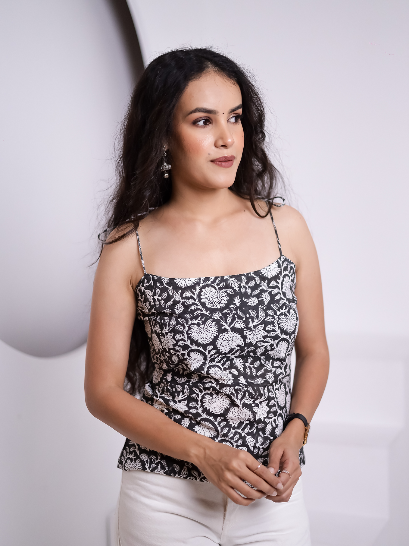 Noorani is bold, feminine, and quietly powerful. Set on a black base with graceful florals, this top features a clean straight neckline and delicate tie-up spaghetti straps that add just the right hint of drama. Light, breathable, and made to turn everyday outfits into statements.